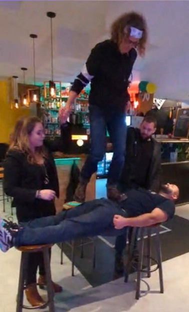 Le spectacle d’hypnose commence, grâce à des tests ludiques, je sélectionne les + réceptifs qui monteront sur scène. Le spectacle se déroule dans un institut de recherche top secret sur des produits du quotidien aux propriétés surprenantes, dans lequel les participants et le public pourront assister en direct aux expériences en cours mais pas encore tout à fait abouties !
